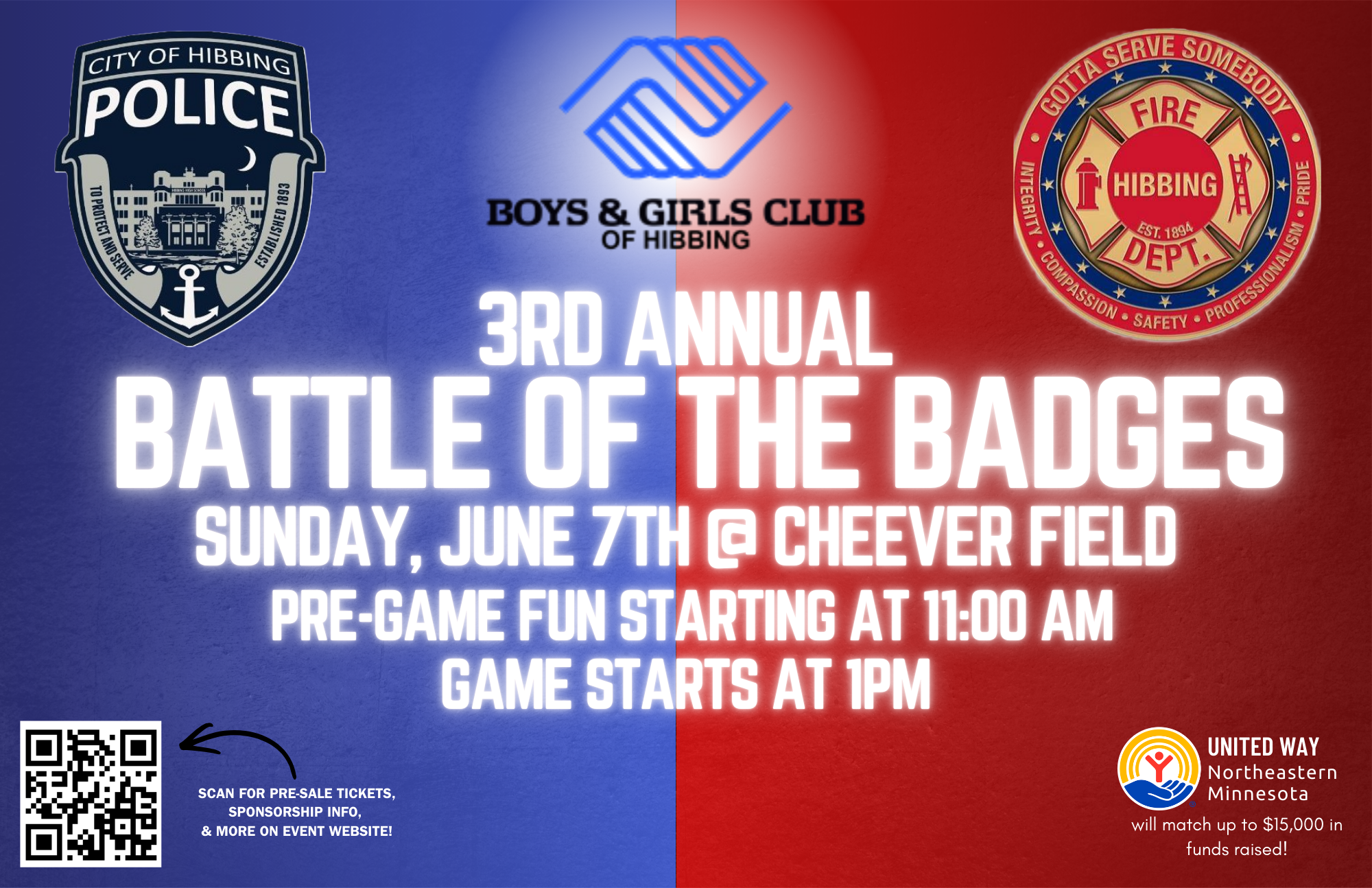 This family-friendly event brings together our local heroes from the Hibbing Police Department 🚓 & Hibbing Fire Department 🔥 for a spirited softball showdown, all in support of the Boys & Girls Club of Hibbing 💙❤️.